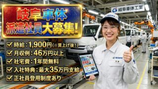 【岐阜車体 派遣求人】時給1,900円に賃上げ!入社特典35万円高収入&寮費無料で安定ライフ!!!岐阜県各務原市のトヨタグループ工場「岐阜車体」で、派遣社員の募集がスタート! ✅ 時給:1,900円(※賃上げ後!) ✅ 月収例:46万円以上...