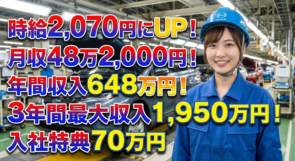 🏭【募集再開!日野自動車 羽村工場 派遣求人】月収58万円超&寮費無料!3年間で1,950万円稼げる最強案件!