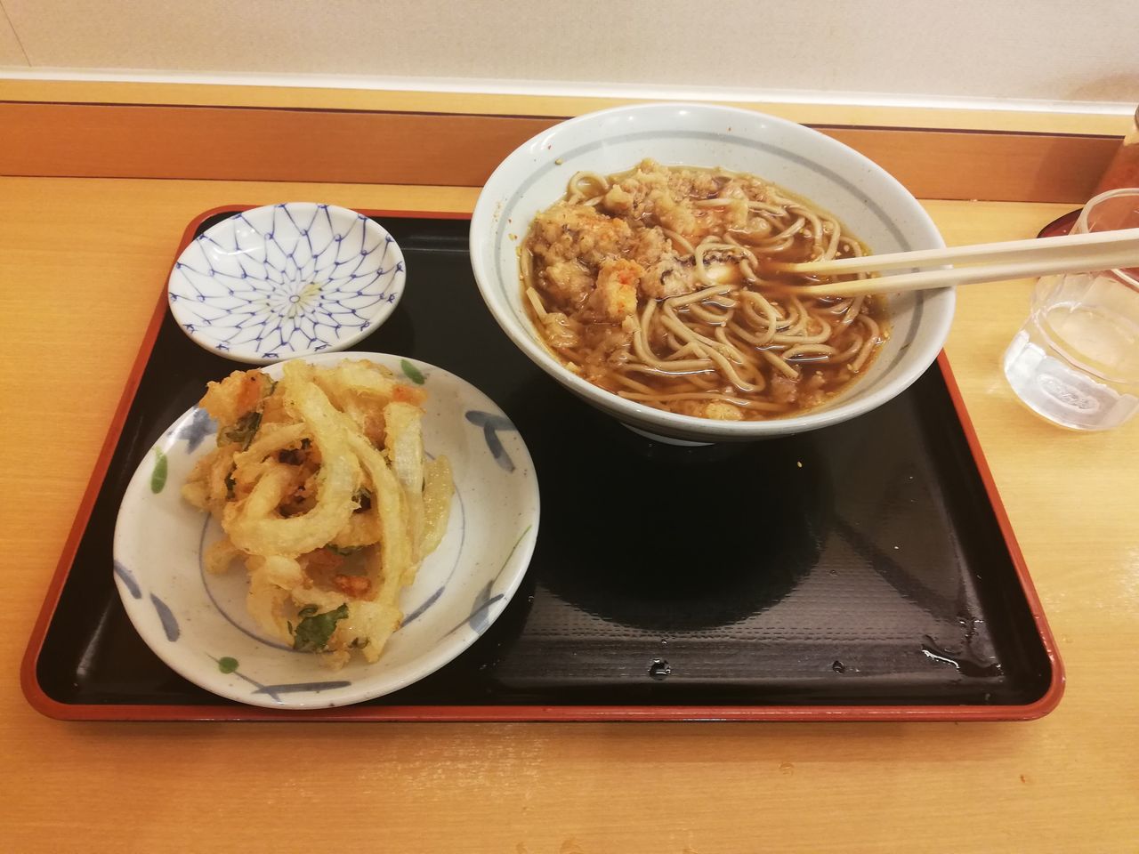 そのあと網戸が破れたので新宿の東急ハンズへ補修テープを探しに行く前にゲソ天そばと煮卵を注文するもゲソ天が野菜入ってなくてかき揚げトッピングを注文する。