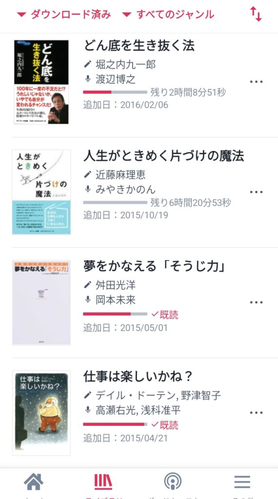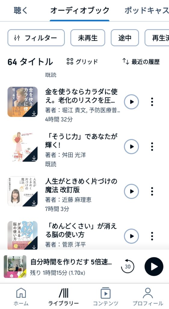 オーディブルは以前は使いにくい印象があったのですが最近見たらだいぶ使いやすくなったので聴き放題のプレミアムプランに入ってそうじ片付け関連のオーディブルを聴きまくっています。