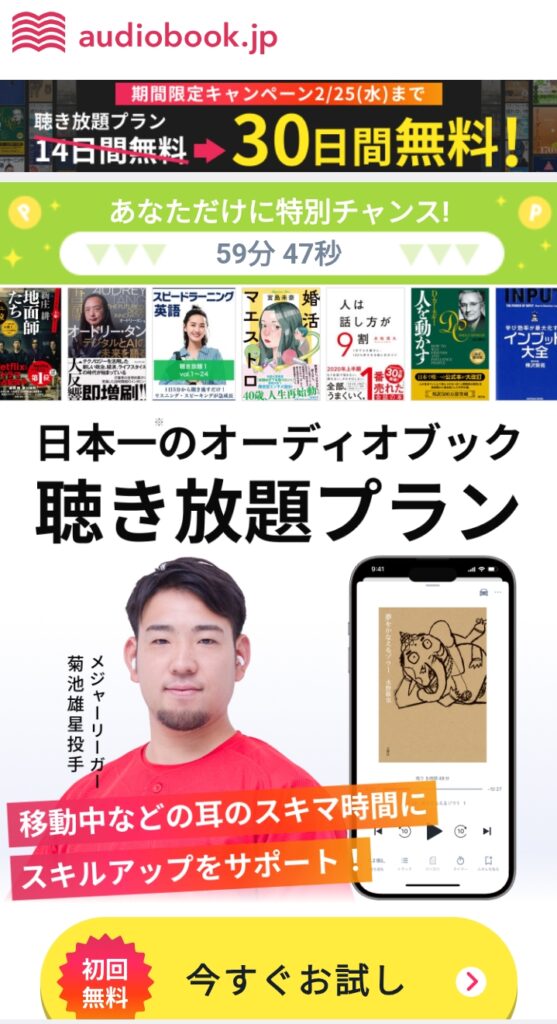 どちらのサービスも今なら30日間無料サービスがあるので1ヶ月間無料でそうじ片付け関連や幸せ成功本のオーディオブックを聴きまくると運がよくなるかもしれませんね😉