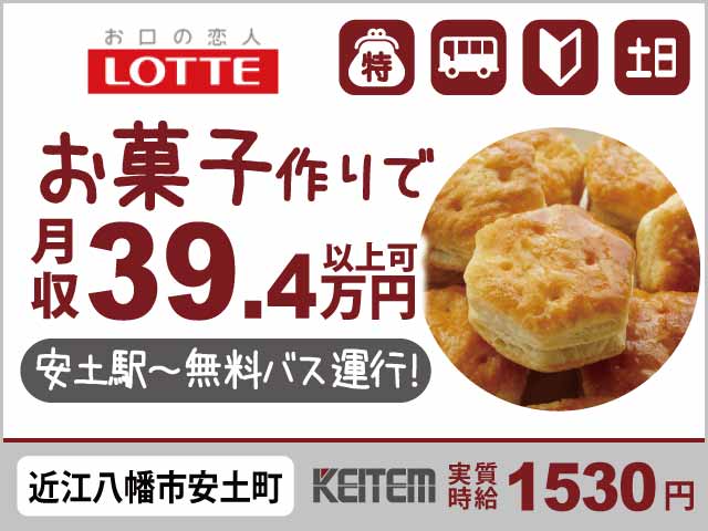 株式会社日本ケイテムの求人記事・検査・検品・滋賀県近江八幡市・【ロッテのお菓子・アイスの製造補助】『実質時給1530円&大手メーカーで長期安定』#月収39.4万円以上可 #20~40代活躍中#安土駅から無料送迎あり #土日休み#検品 #機械...