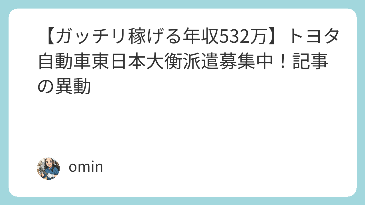 PR PR スポンサーリンク 【ガッチリ稼げる年収532万】トヨタ自動車東日本大衡派遣募集中!記事の異動 ブログ X Facebook はてブ LINE コピー 2026.04.032026.04.26 おすすめ期間工3選 ▶ トヨタ自動車【入社祝い金100万円&日給350円UP↗】 ▶ 日産自動車九州【年収584.8万円&入社特典100万円】 ▶ 豊田自動織機【日給10,500円&入社祝い金50万円↗60万円Upで稼げる!】 おすすめ期間工3選 ▶ トヨタ自動車【入社祝い金100万円&日給350円UP↗】 ▶ 日産自動車九州【年収584.8万円&入社特典100万円】 ▶ 豊田自動織機【日給10,500円&入社祝い金50万円↗60万円Upで稼げる!】 この記事は2026年4月26日に異動しました。