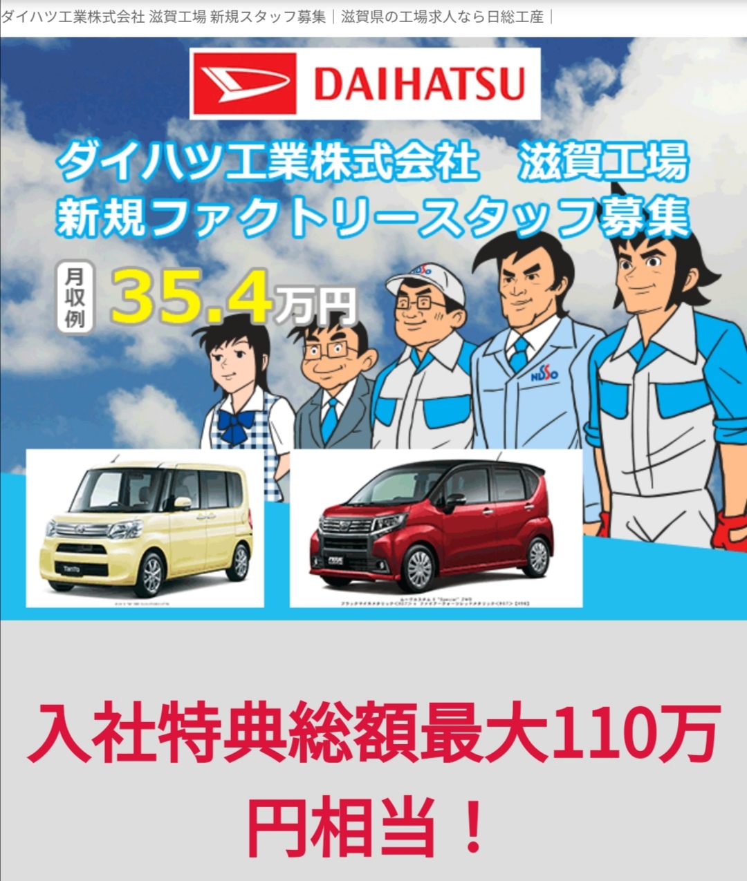 滋賀県蒲生郡竜王町>★即内定実施中★時給1700円!入社特典110万円相当!ダイハツ工業!【寮完備】『未経験OK』 月収例35万円/ 自動車部品または車体の組立など☆ミドル活躍中