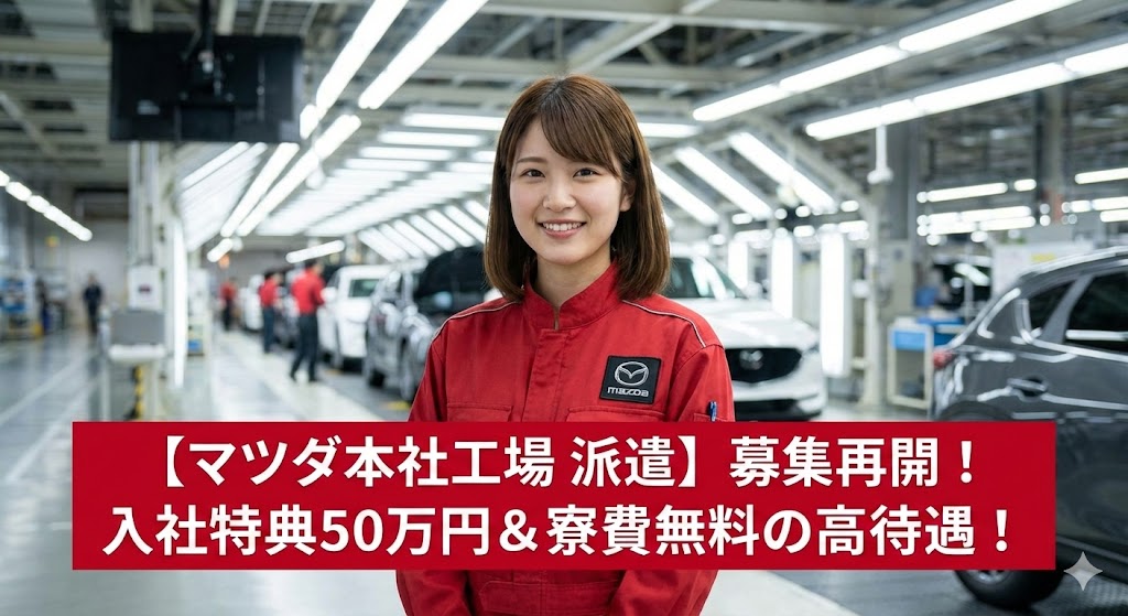 【マツダ本社工場 派遣】募集再開!入社特典50万円&寮費無料の高待遇!