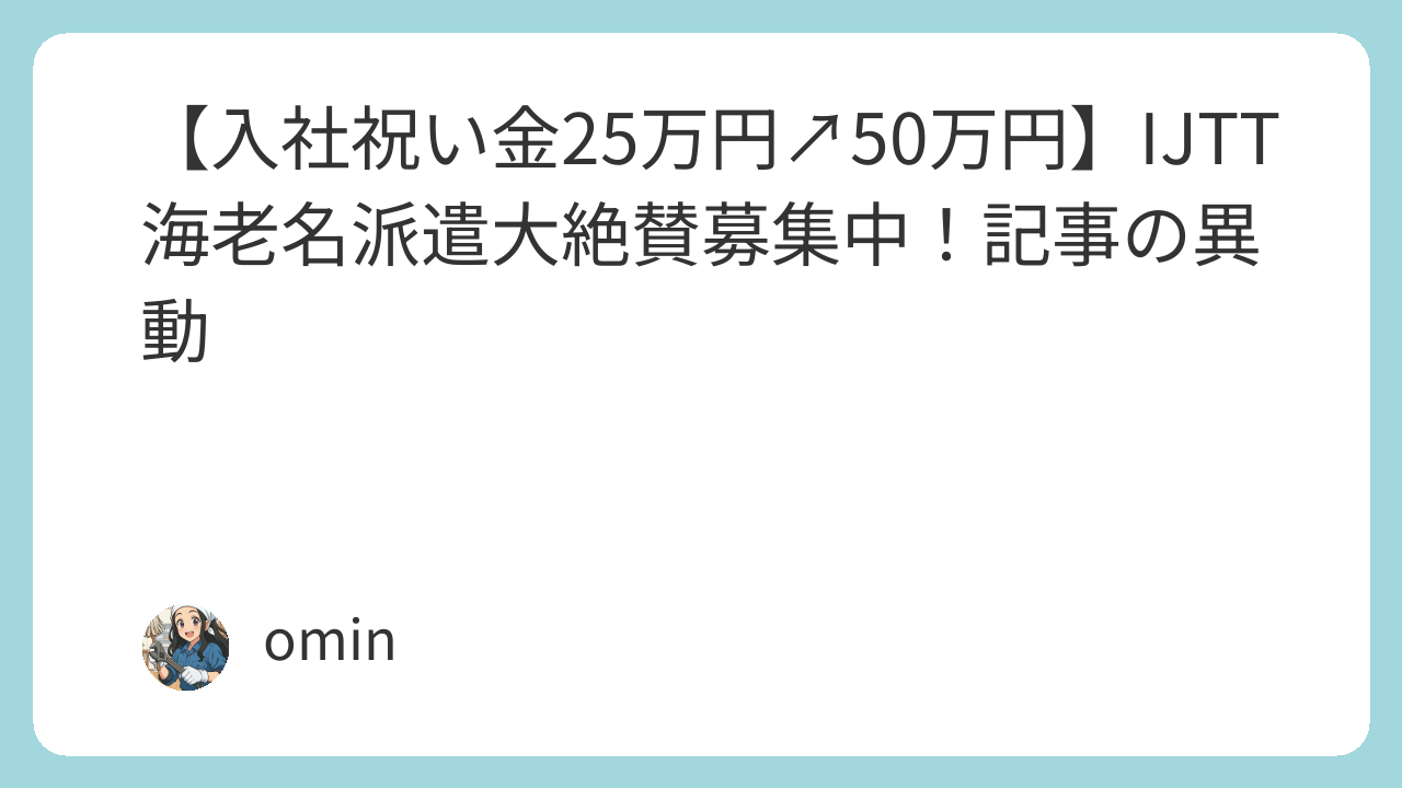 PR PR スポンサーリンク 【入社祝い金25万円↗50万円】IJTT海老名派遣大絶賛募集中!記事の異動 ブログ X Facebook はてブ LINE コピー 2025.11.132026.04.22 おすすめ期間工3選 ▶ トヨタ自動車【入社祝い金100万円&日給350円UP↗】 ▶ 日産自動車九州【年収584.8万円&入社特典100万円】 ▶ 豊田自動織機【日給10,500円&入社祝い金50万円↗60万円Upで稼げる!】 おすすめ期間工3選 ▶ トヨタ自動車【入社祝い金100万円&日給350円UP↗】 ▶ 日産自動車九州【年収584.8万円&入社特典100万円】 ▶ 豊田自動織機【日給10,500円&入社祝い金50万円↗60万円Upで稼げる!】 この記事は2026年4月22日に異動しました。