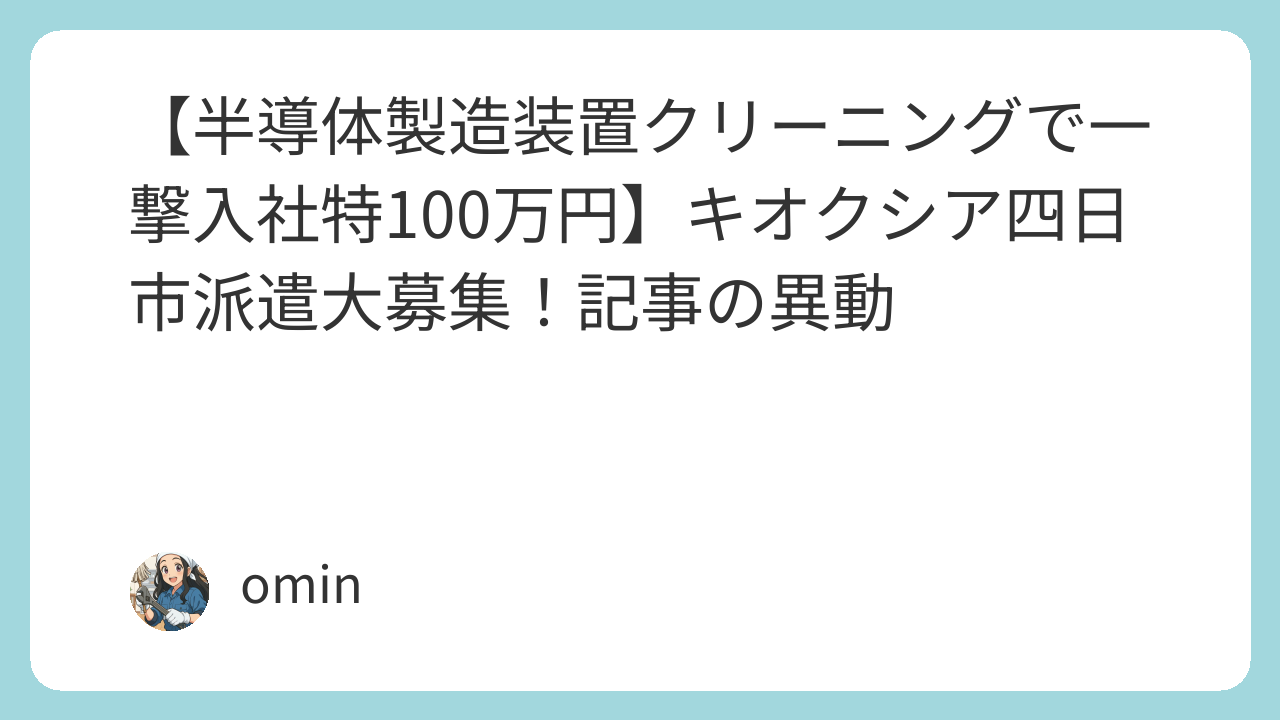 PR PR スポンサーリンク 【半導体製造装置クリーニングで一撃入社特100万円】キオクシア四日市派遣大募集!記事の異動 ブログ X Facebook はてブ LINE コピー 2025.12.182026.03.06 おすすめ期間工3選 ▶ トヨタ自動車【入社祝い金100万円&日給350円UP↗】 ▶ 日産自動車九州【年収584.8万円&入社特典100万円】 ▶ 豊田自動織機【日給10,500円&入社祝い金50万円↗60万円Upで稼げる!】 おすすめ期間工3選 ▶ トヨタ自動車【入社祝い金100万円&日給350円UP↗】 ▶ 日産自動車九州【年収584.8万円&入社特典100万円】 ▶ 豊田自動織機【日給10,500円&入社祝い金50万円↗60万円Upで稼げる!】 この記事は2026年3月6日に異動しました。