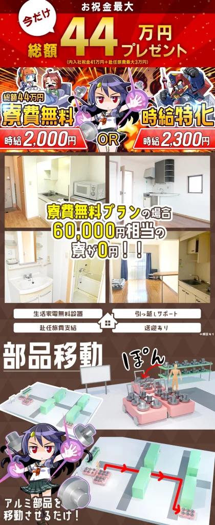 東海で人気の工場・製造業求人ランキング1位!愛知県高時給派遣20名大量募集!!今だけ特典44万円+寮費無料!!✿時給2000円!✿通勤コースは時給2300円!!