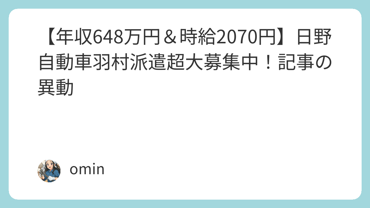 PR PR スポンサーリンク 【年収648万円&時給2070円】日野自動車羽村派遣超大募集中!記事の異動 ブログ X Facebook はてブ LINE コピー 2025.09.092026.03.04 おすすめ期間工3選 ▶ トヨタ自動車【入社祝い金100万円&日給350円UP↗】 ▶ 日産自動車九州【年収584.8万円&入社特典100万円】 ▶ 豊田自動織機【日給10,500円&入社祝い金50万円↗60万円Upで稼げる!】 おすすめ期間工3選 ▶ トヨタ自動車【入社祝い金100万円&日給350円UP↗】 ▶ 日産自動車九州【年収584.8万円&入社特典100万円】 ▶ 豊田自動織機【日給10,500円&入社祝い金50万円↗60万円Upで稼げる!】 この記事は2026年3月4日に異動しました。