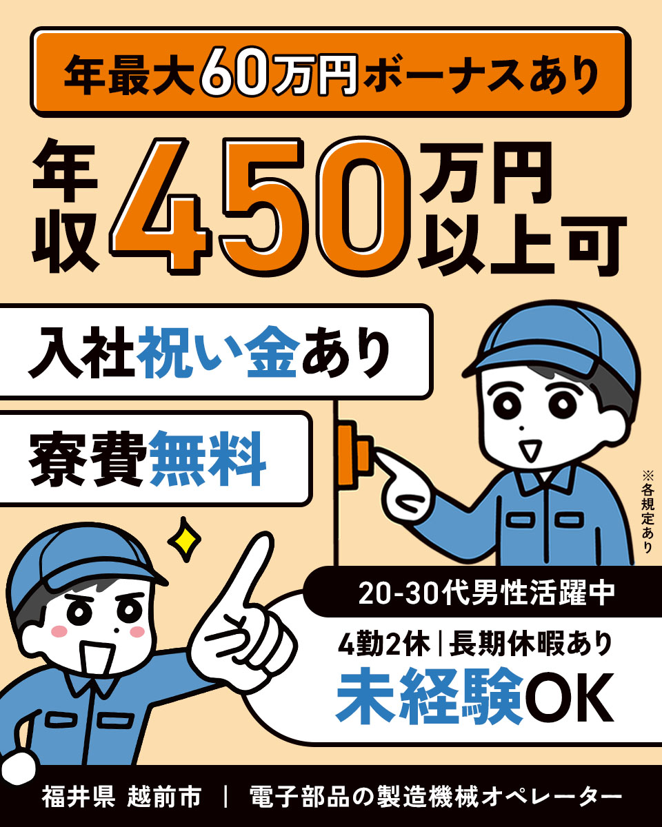 株式会社日本ケイテム 重たいものナシ!軽作業メインのお仕事でしっかり高収入! 20-30代男女活躍中 寮費無料 月収例46万円以上 ※各規定あり 実質時給1,610円 入社祝い金1万円 未経験OK 選べる1Ror2LDK 長期休暇あり 4勤2休 車通勤OK 福井県 越前市 電子部品のマシンオペレーターなど