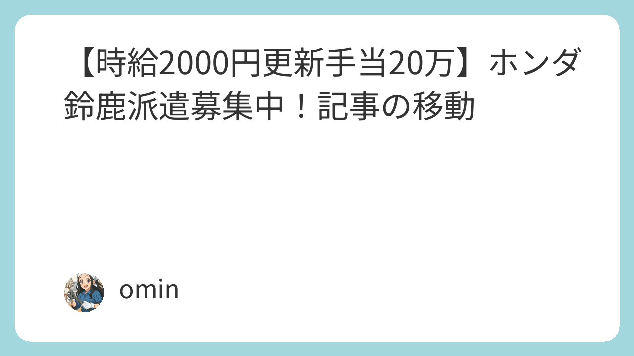 PR PR スポンサーリンク 【時給2000円更新手当20万】ホンダ鈴鹿派遣募集中!記事の移動 ブログ X Facebook はてブ LINE コピー 2026.01.042026.04.11 おすすめ期間工3選 ▶ トヨタ自動車【入社祝い金100万円&日給350円UP↗】 ▶ 日産自動車九州【年収584.8万円&入社特典100万円】 ▶ 豊田自動織機【日給10,500円&入社祝い金50万円↗60万円Upで稼げる!】 おすすめ期間工3選 ▶ トヨタ自動車【入社祝い金100万円&日給350円UP↗】 ▶ 日産自動車九州【年収584.8万円&入社特典100万円】 ▶ 豊田自動織機【日給10,500円&入社祝い金50万円↗60万円Upで稼げる!】 この記事は2026年4月11日に異動しました。