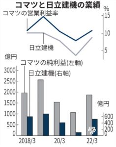 コマツが31日に発表した2021年4~12月期の連結決算(米国会計基準)は純利益が前年同期比2.4倍の1555億円で、新型コロナウイルスの感染拡大前の19年度実績も上回った。世界的なインフラ投資や資源高に加え、東南アジアで機能を抑えた割安な建機が好調だ。同日には日立建機が22年3月期業績予想(国際会計基準)を上方修正した。