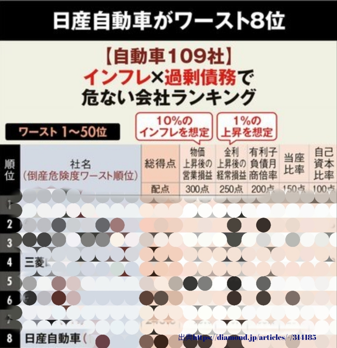 実は発表されていた!【自動車109社】倒産危険度ランキング2023年「過剰債務×インフレ耐久度」反映の完全版!8位日産、1位は?