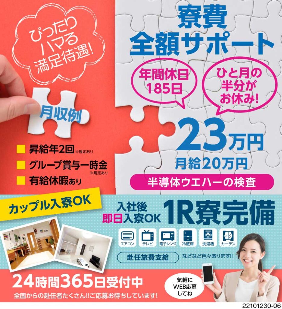 \寮費全額サポート×即入寮/月の半分はお休み<年間休日185日>50代も活躍中の半導体製造の検査◎