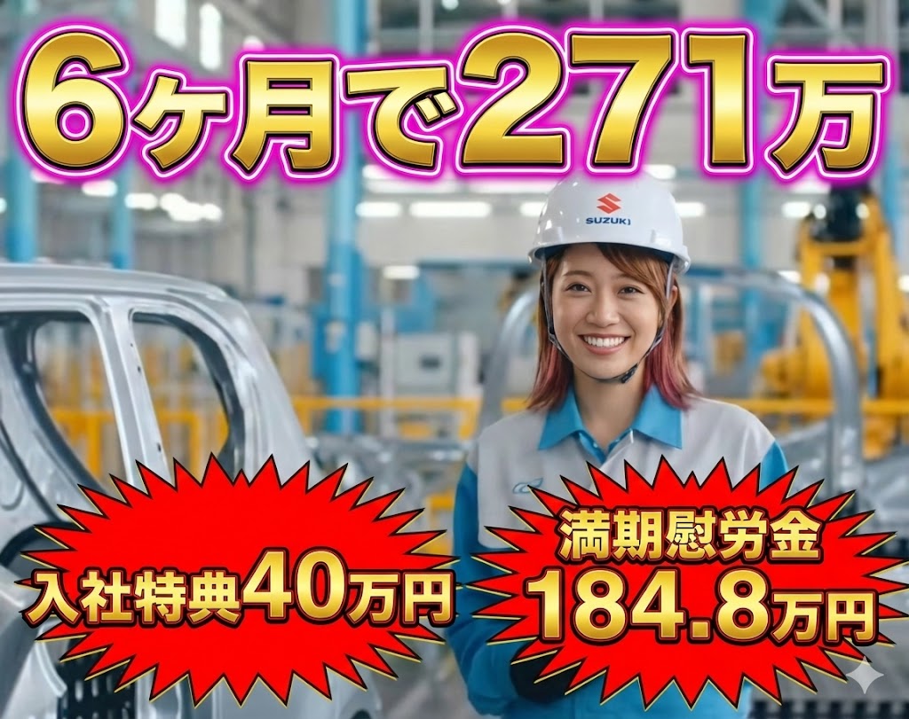 スズキ入社特典40万円慰労金184万円寮費光熱費無料で期間工を絶賛募集中!