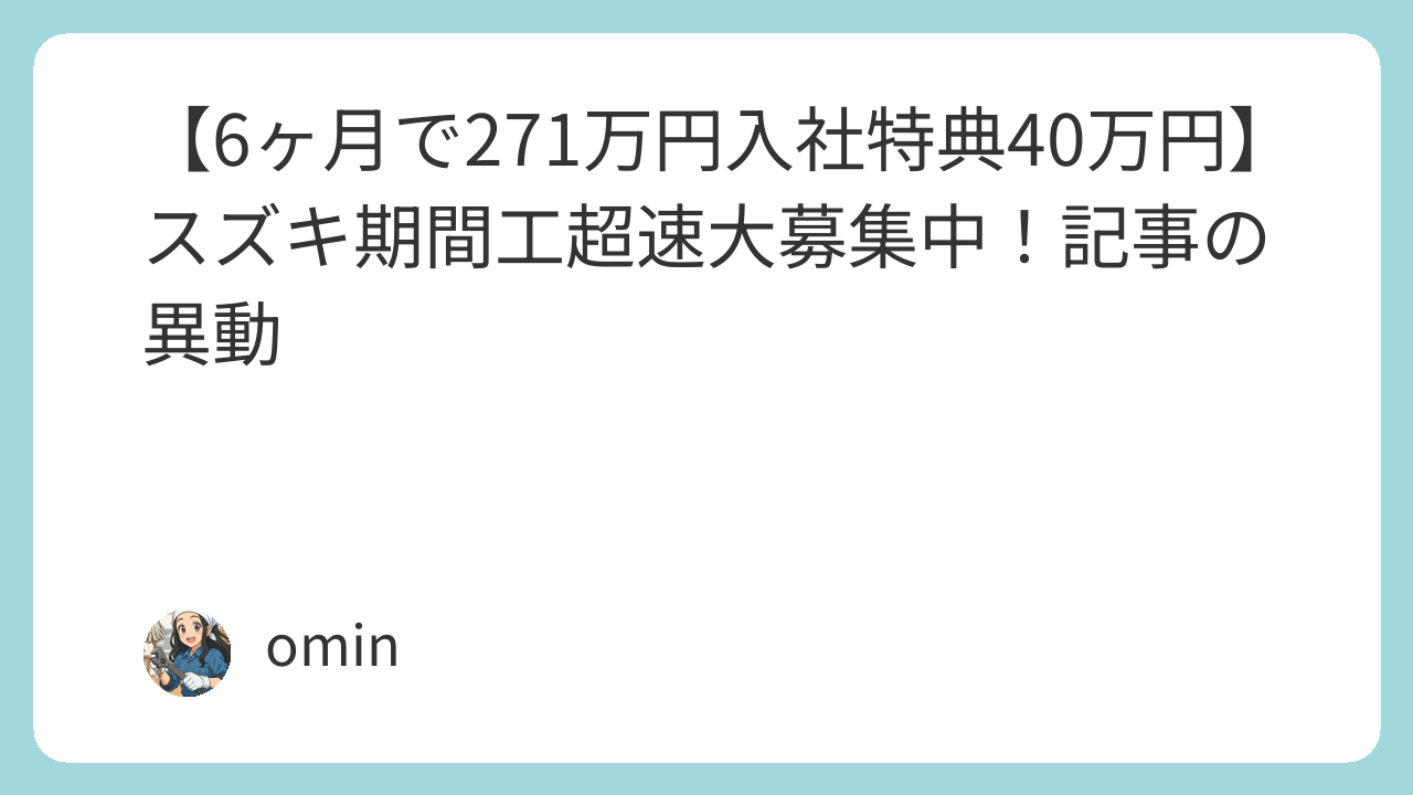 PR PR スポンサーリンク 【6ヶ月で271万円入社特典40万円】スズキ期間工超速大募集中!記事の異動 ブログ X Facebook はてブ LINE コピー 2026.01.032026.04.13 おすすめ期間工3選 ▶ トヨタ自動車【入社祝い金100万円&日給350円UP↗】 ▶ 日産自動車九州【年収584.8万円&入社特典100万円】 ▶ 豊田自動織機【日給10,500円&入社祝い金50万円↗60万円Upで稼げる!】 おすすめ期間工3選 ▶ トヨタ自動車【入社祝い金100万円&日給350円UP↗】 ▶ 日産自動車九州【年収584.8万円&入社特典100万円】 ▶ 豊田自動織機【日給10,500円&入社祝い金50万円↗60万円Upで稼げる!】 この記事は2026年4月13日に異動しました。