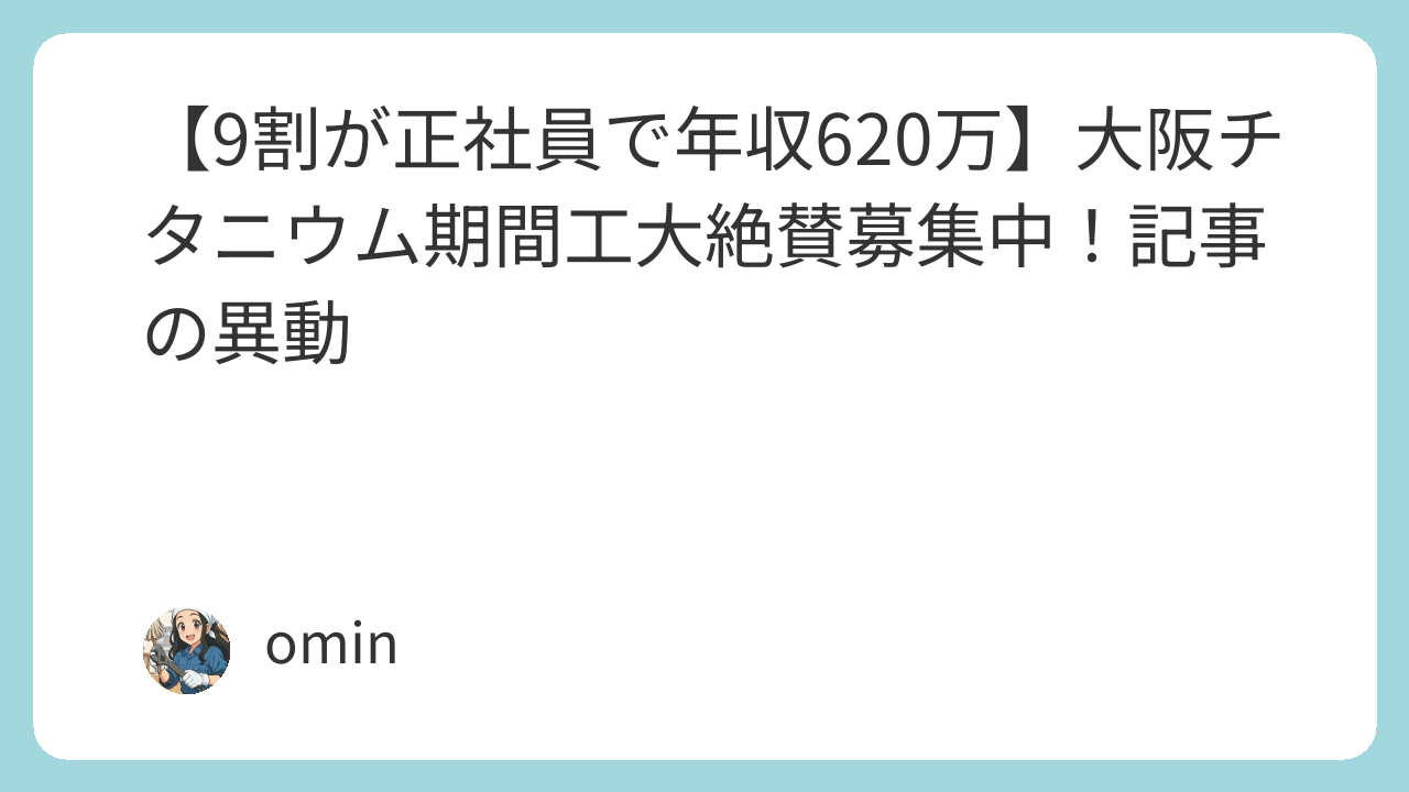 PR PR スポンサーリンク 【9割が正社員で年収620万】大阪チタニウム期間工大絶賛募集中!記事の異動 ブログ X Facebook はてブ LINE コピー 2026.01.052026.04.17 おすすめ期間工3選 ▶ トヨタ自動車【入社祝い金100万円&日給350円UP↗】 ▶ 日産自動車九州【年収584.8万円&入社特典100万円】 ▶ 豊田自動織機【日給10,500円&入社祝い金50万円↗60万円Upで稼げる!】 おすすめ期間工3選 ▶ トヨタ自動車【入社祝い金100万円&日給350円UP↗】 ▶ 日産自動車九州【年収584.8万円&入社特典100万円】 ▶ 豊田自動織機【日給10,500円&入社祝い金50万円↗60万円Upで稼げる!】 この記事は2026年4月17日に異動しました。