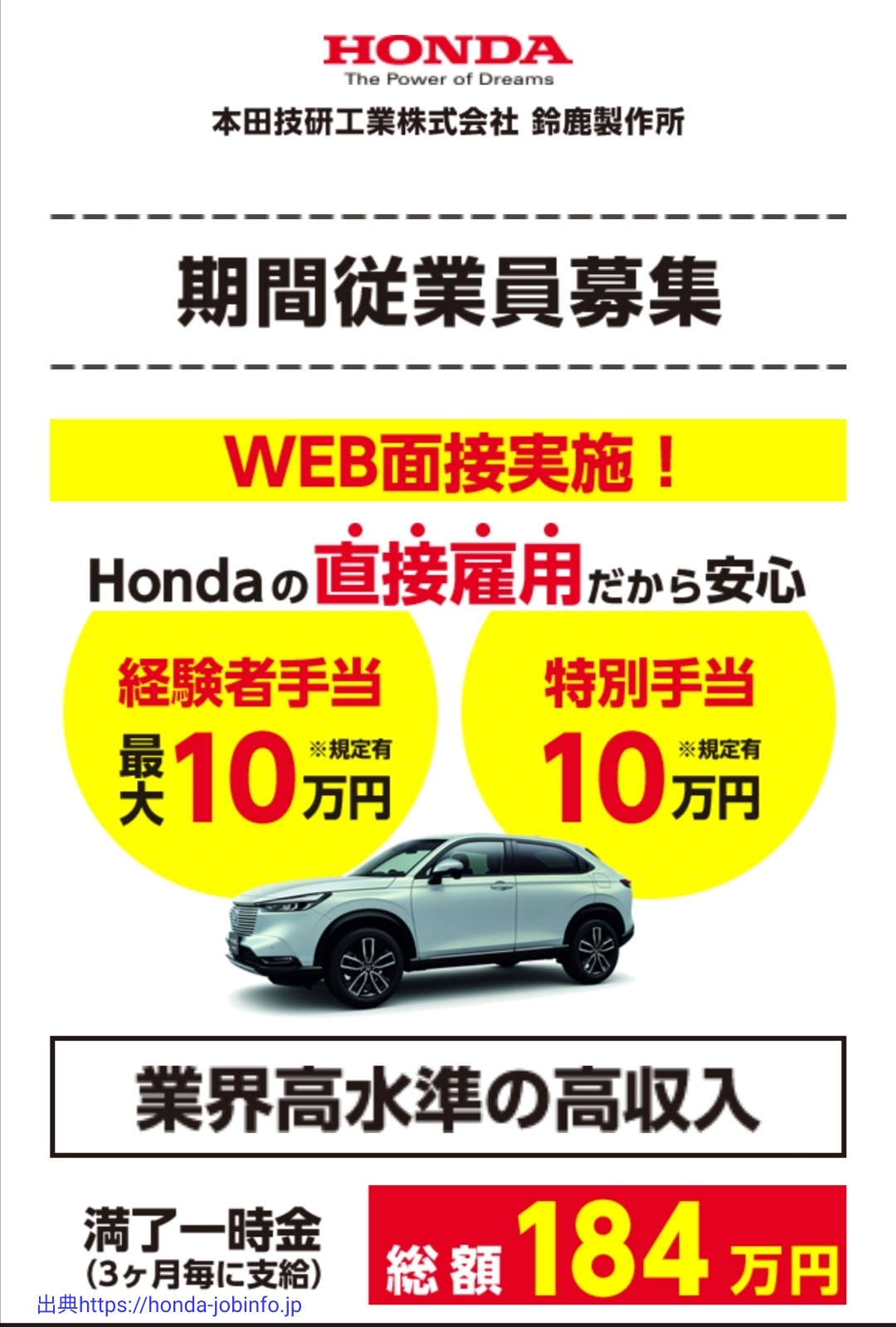 【三重県鈴鹿市】Honda期間従業員募集(直接雇用)WEB面接実施中!【満了一時金総額184万円/月収例30万円以上/経験者手当最大10万円/特別手当10万円】【寮費・水道光熱費無料/食事補助月13,000円/1勤務1食無料/赴任帰任旅費支給】