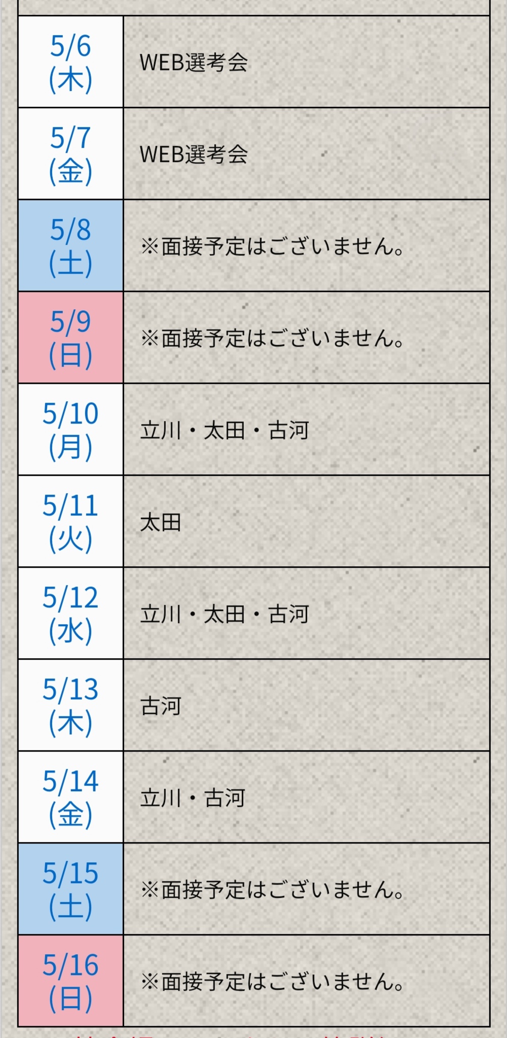 面接は5月6日から再開されて、6,7はWEB面接で後は平日は東京と群馬で対面面接のようです。