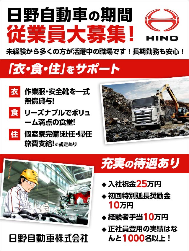 日野自動車がトヨタばりに全国で期間工を募集中です。