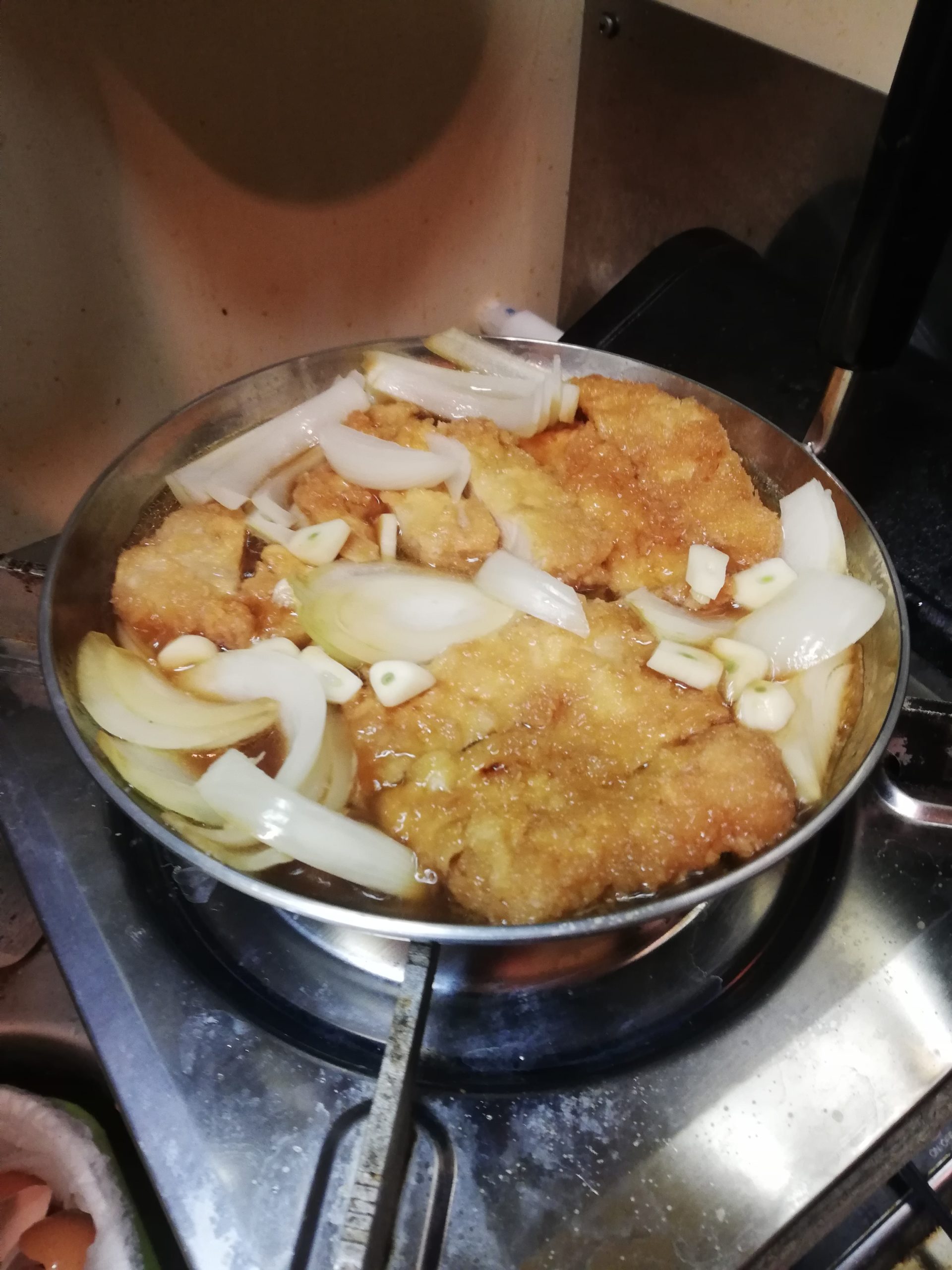 先日購入した18センチ親子丼鍋(通常は16センチ)にとんかつを1.5枚入れる。余裕で入るこの安定感。