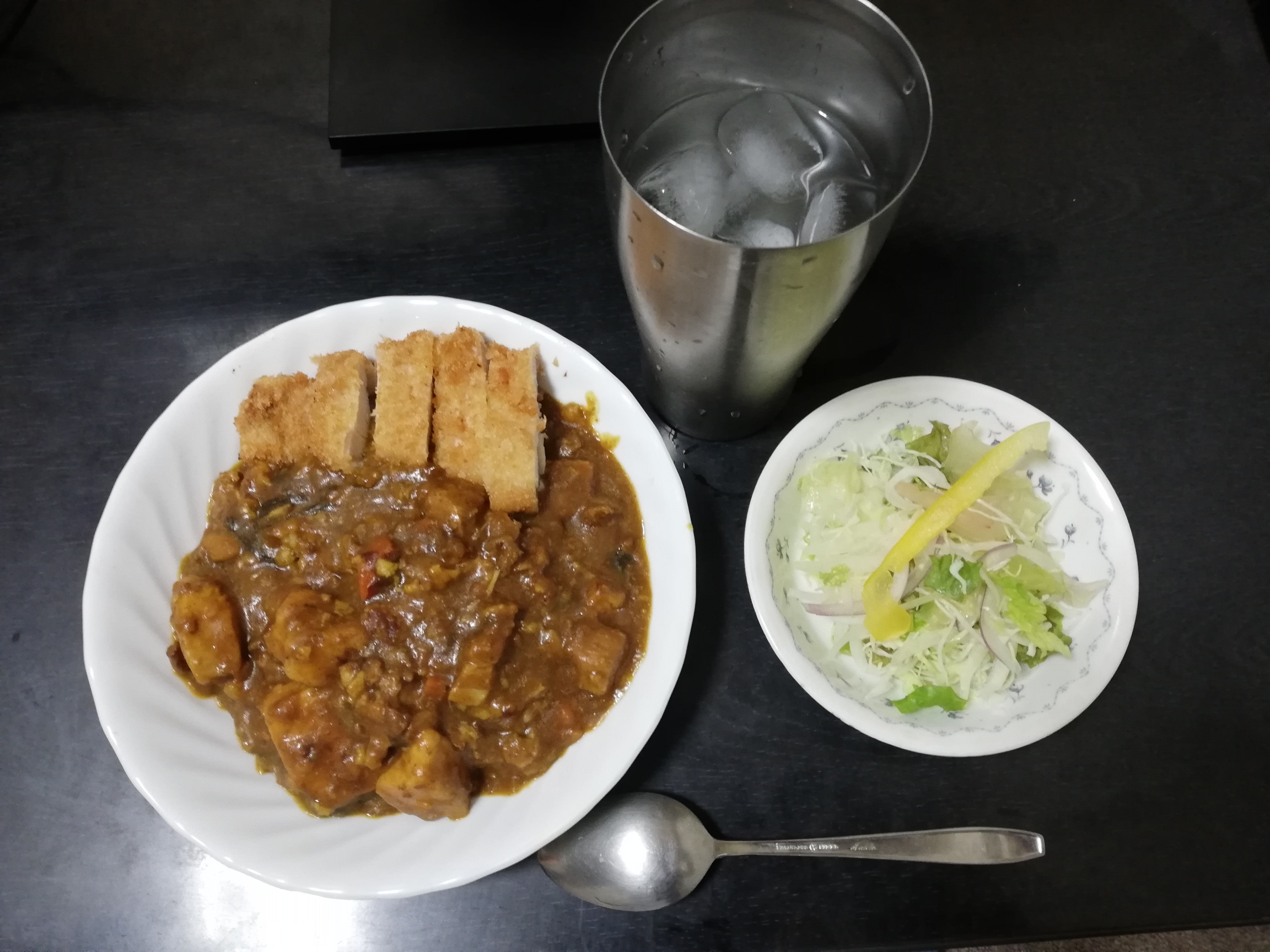 カツカレーにしました。カレーだと古いご飯でも食べれるんですよね。