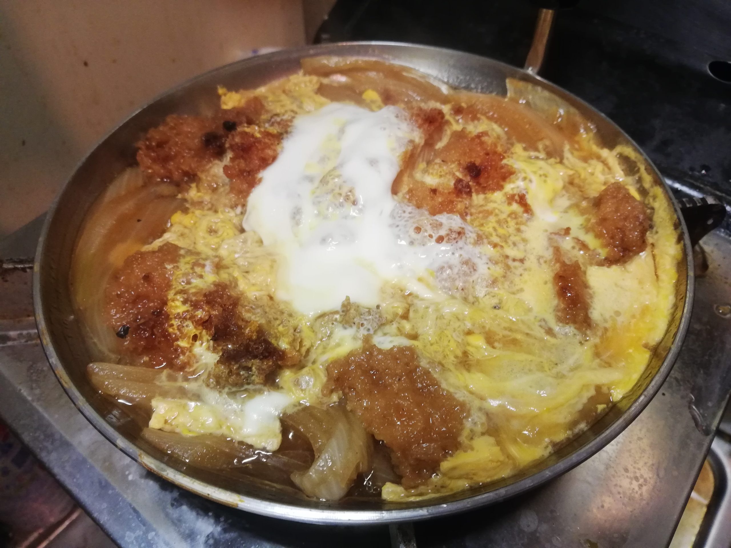 玉ねぎを切って親子丼鍋に敷き詰めてから風呂に入りノンフライヤーで温めたとんかつを乗せて煮込みました。