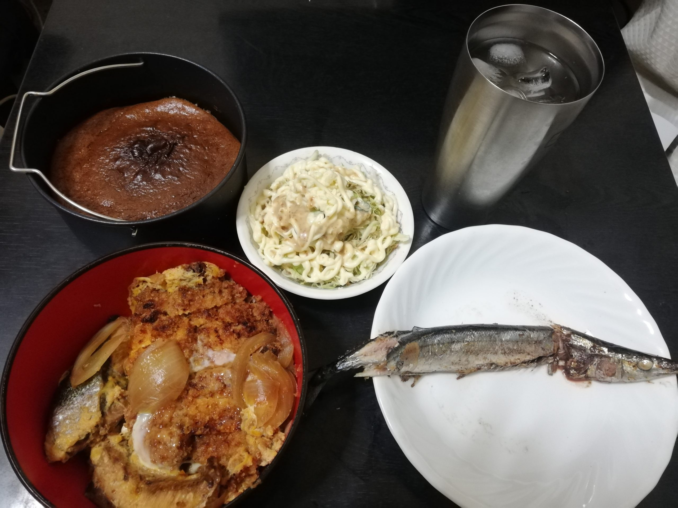 本日の期間工飯、とんかつ鶏のささみカツとぶりの期間工丼スペシャル2とサンマとチョコチーズケーキ