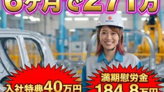 ブログ 【6ヶ月で271万円入社特典40万円】スズキ期間工超速大募集中! 【スズキ期間工】湖西市・軽乗用車&船外機製造|特典40万円+寮費無料で安定高収入!『Sのマークのスズキ♪』でおなじみのスズキ㈱が、静岡県湖西市白須賀で期間従業員を募集中!日給10,400円・月収例33万円・特典40万円・寮費無料と、全国でも... 2025.12.04 ブログ